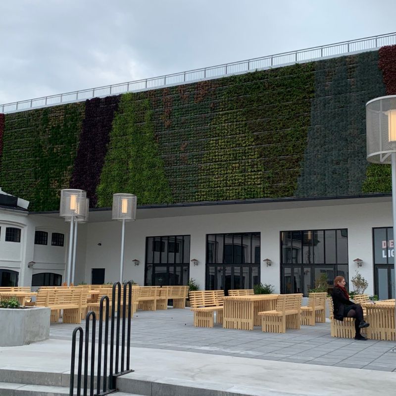 En grøn væg kan bare noget! Den tidligere triste baggård er blevet til et attraktivt byrum, der tiltrækker mange gæster til torvet og i caféerne. PLH Arkitekter tænkte en plantevæg ind i renoveringen fra starten. For at få den rette forståelse for bygningens historie, har PLH Arkitekter kigget på gamle fotos og tegninger for at se, hvordan facaderne oprindeligt så ud, og hvad bygningen engang blev brugt til. Og netop dét har skabt grobund for den grønne væg, som pryder gårdrummet. Plantevæggen er skabt i et rebmotiv, der refererer til bygningens tidligere funktion som rebslageri og er den største plantevæg i Danmark.